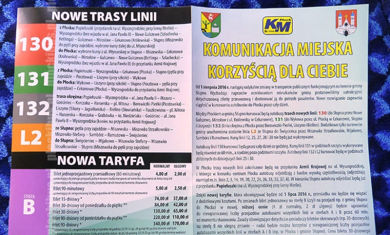 Oprócz nowych cen biletów (które wejdą w życie 1 lipca), od 1 sierpnia przestaną istnieć linie nr 12, 25, 27, 28 i 30. W zamian uruchomione zostaną cztery nowe linie: 130, 131, 132 i gminna L2. Trzy pierwsze będą miały w Płocku wspólny przystanek końcowy „Armii Krajowej” (przy Lidlu) oraz początkowy „Popiełuszki” (przy Leroy Merlin). Będą to najwyższe numery linii w historii płockiej komunikacji. Do tej pory tylko linie nocne miały trzycyfrowe numery (100, 101, 102), które wraz z reformą sieci w 2012 r. zostały zmienione na „N-ki”.