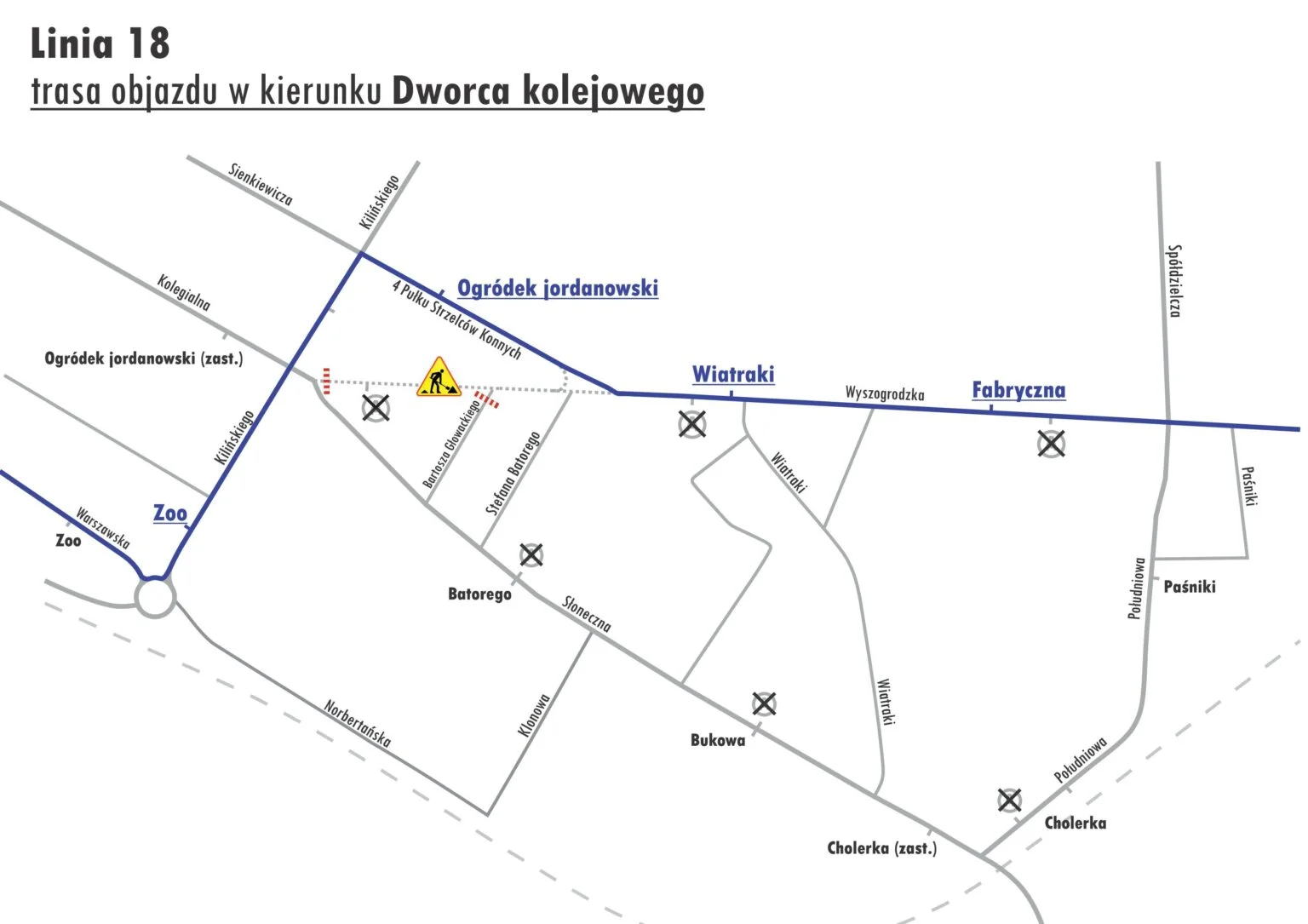 - w kierunku Dworca kolejowego – objazd ul. Wyszogrodzką (z pominięciem ul. Południowej, Słonecznej i Głowackiego),