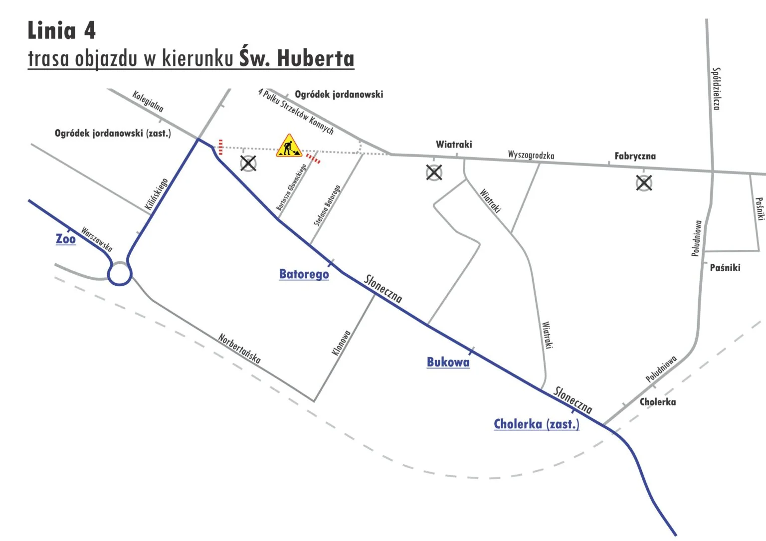 - w kierunku Św. Huberta – objazd ul. Słoneczną,