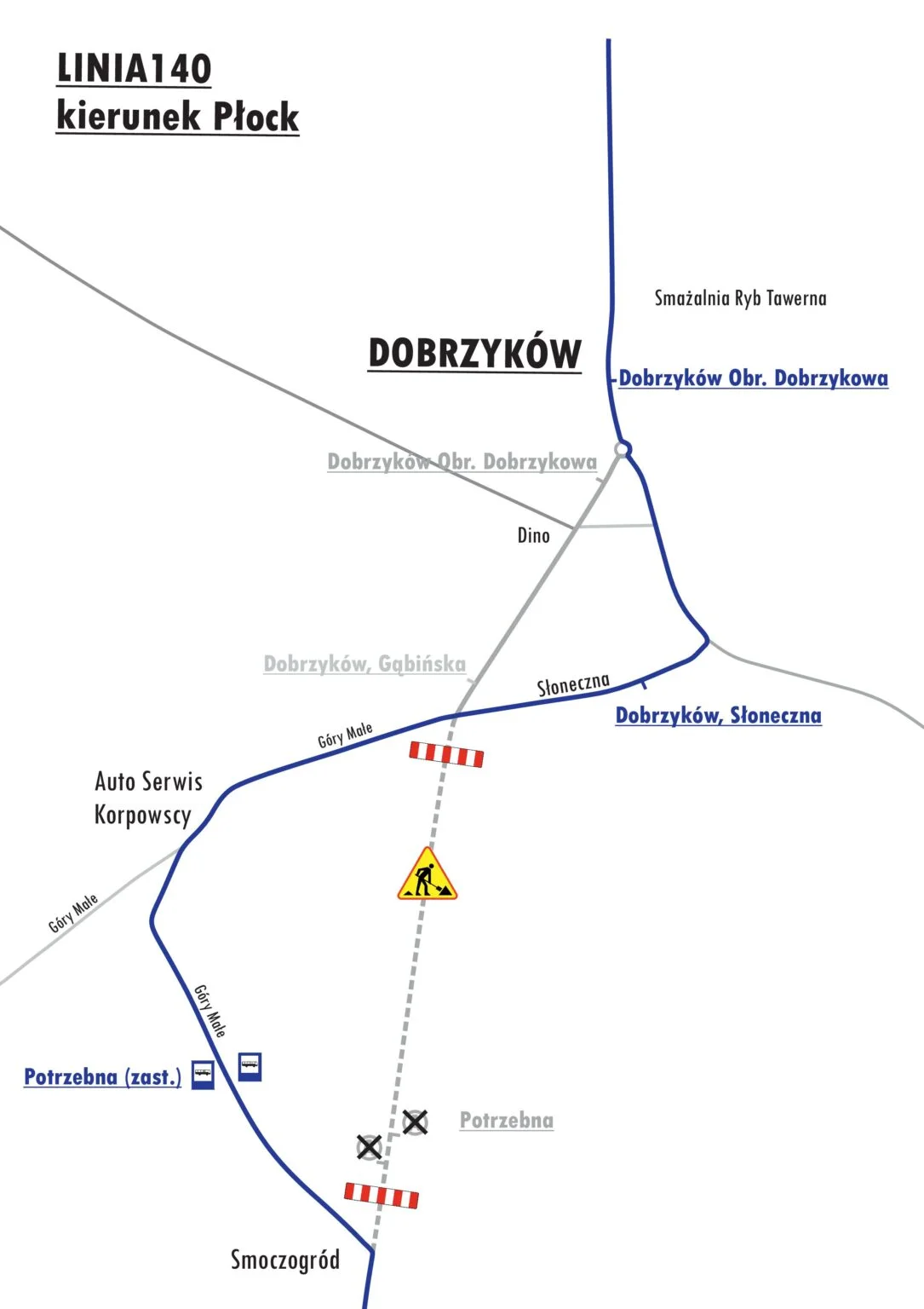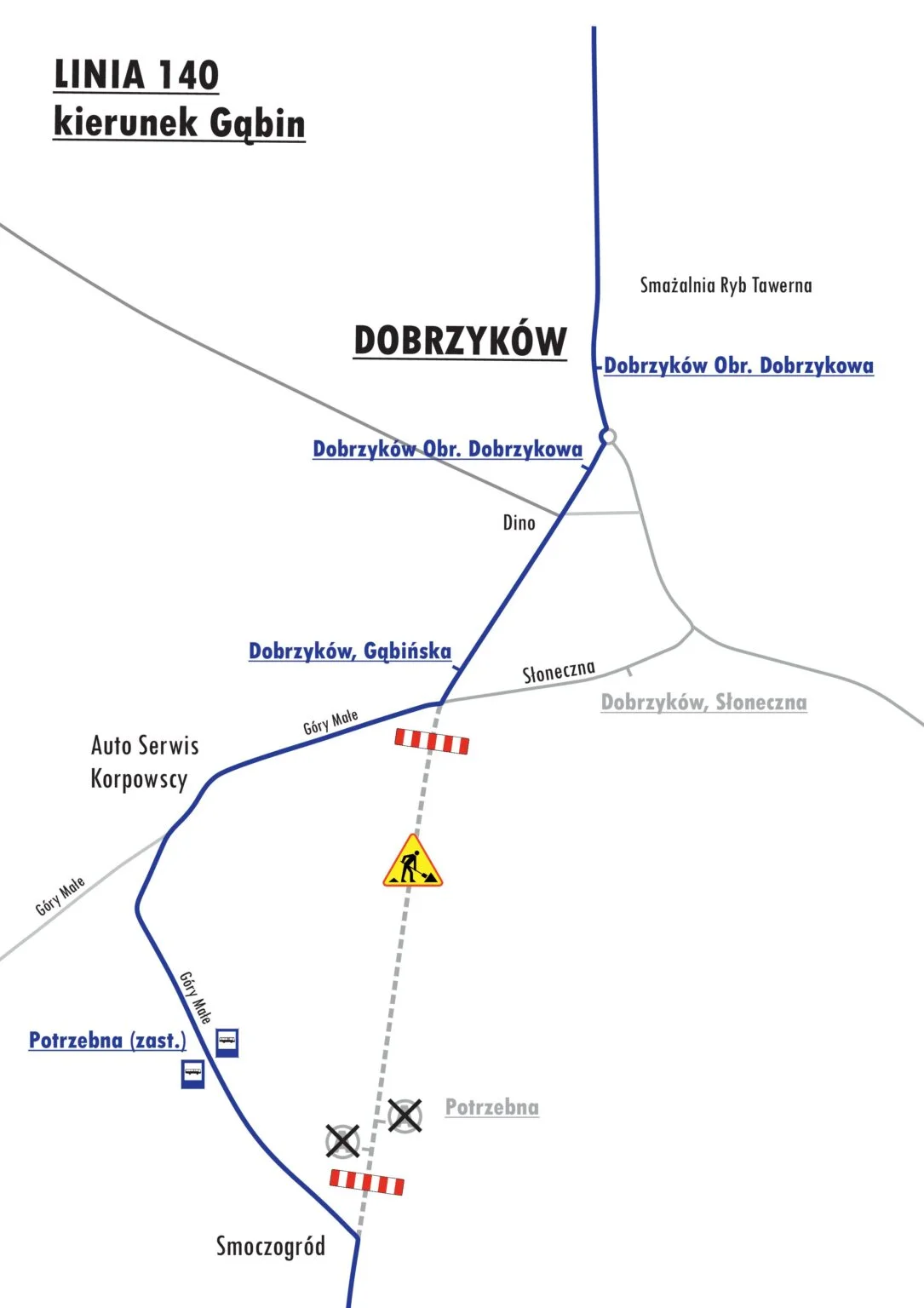 Od 2 marca, w związku z zamknięciem dla ruchu drogi wojewódzkiej nr 574 z powodu przebudowy mostu w Dobrzykowie, autobusy linii 140 kursują w obydwu kierunkach objazdem przez Góry Małe. Autobusy omijają przystanek Potrzebna. Na trasie objazdu uruchomiony został przystanek zastępczy.